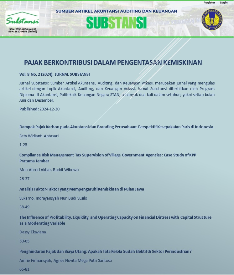 Vol. 9 No. 2 (2025)Jurnal Substansi: Sumber Artikel Akuntansi, Auditing, dan Keuangan Vokasi, merupakan jurnal yang mengulas artikel dengan topik Akuntansi, Auditing, dan Keuangan Vokasi. Jurnal Substansi diterbitkan oleh Program Diploma III Akuntansi dan Sarjana Terapan Akuntansi Sektor Publik, Politeknik Keuangan Negara STAN, sebanyak dua kali dalam setahun, yakni setiap bulan Juni dan Desember..