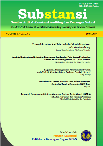 Vol. 5 No. 2 (2021)Jurnal Substansi: Sumber Artikel Akuntansi, Auditing, dan Keuangan Vokasi, merupakan jurnal yang mengulas artikel dengan topik Akuntansi, Auditing, dan Keuangan Vokasi. Jurnal Substansi diterbitkan oleh Program Diploma III Akuntansi Sektor Publik, Politeknik Keuangan Negara STAN, sebanyak dua kali dalam setahun, yakni setiap bulan Juni dan Desember.